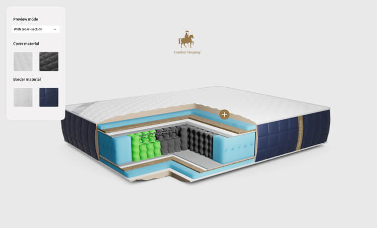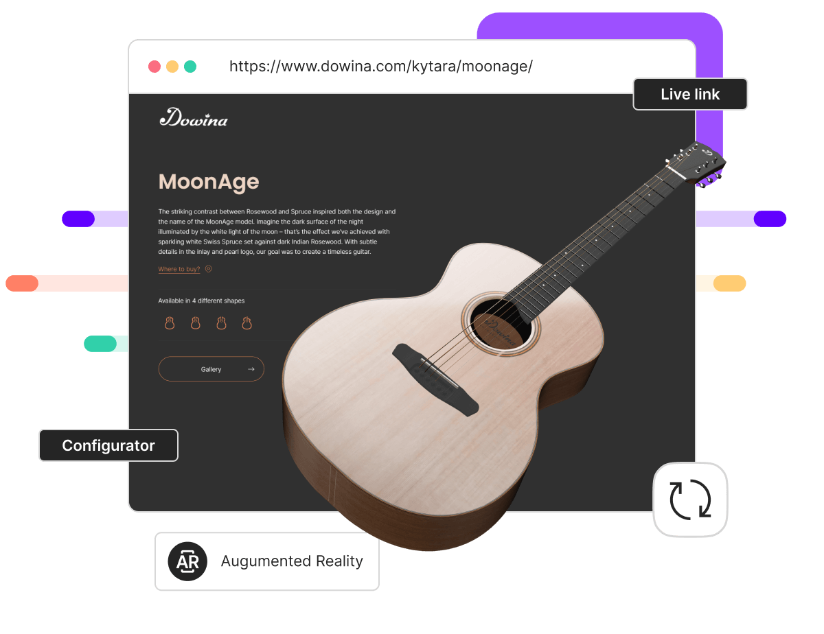 Create 3D interactive configurators to display information about products, including materials, color variations, and mobility.