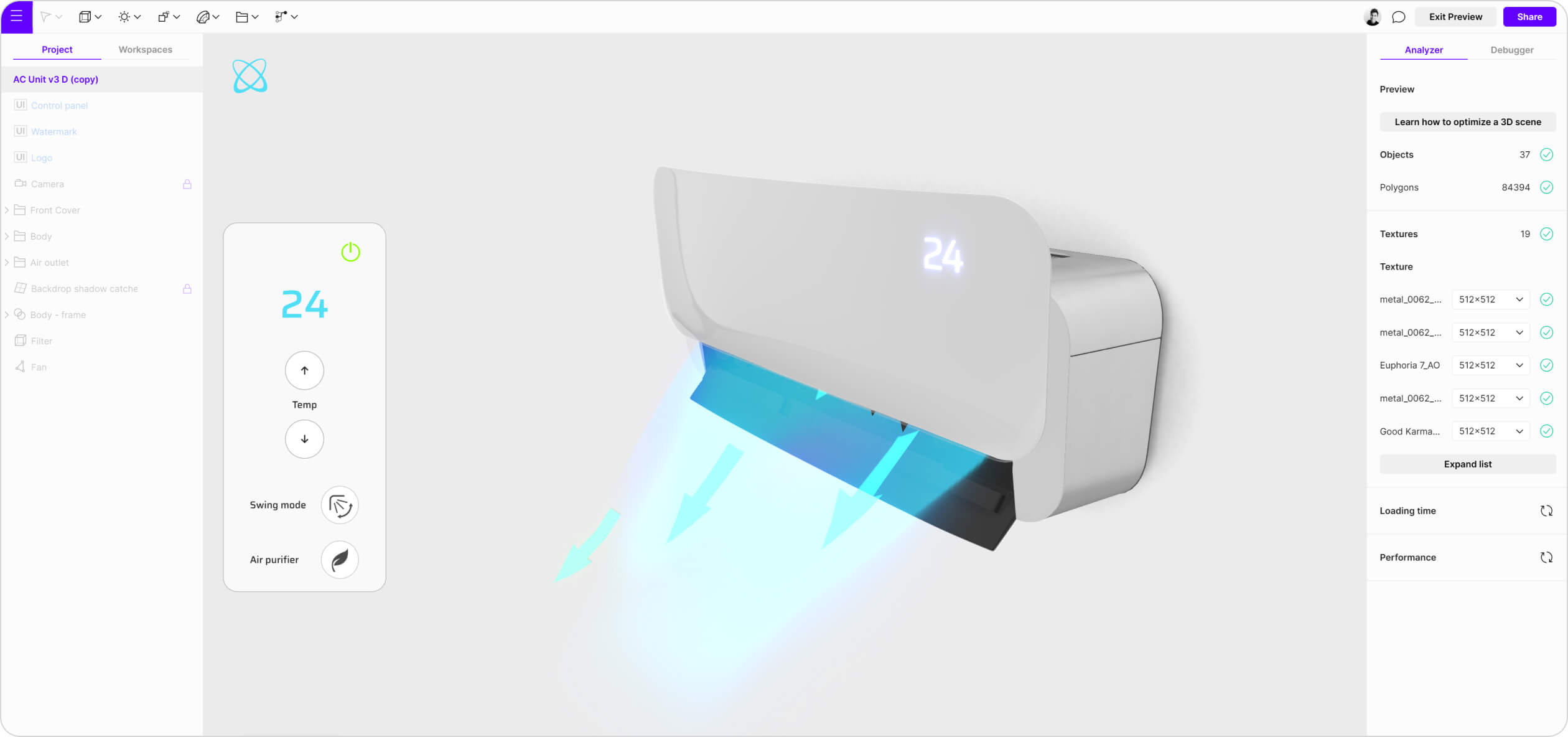 The configurator can be used as a dynamic visualization of the system's operation as specified by the product design teams. It easily becomes a useful tool for multiple departments that lets the user observe the real-time performance of the AC unit, the material composition, as well as see the dimensions and the user interface. The air conditioning unit configurator is also a digital visualization that lets consumers set up and test the cooling system in real-time by selecting details for cooling requirements, and energy efficiency preferences.