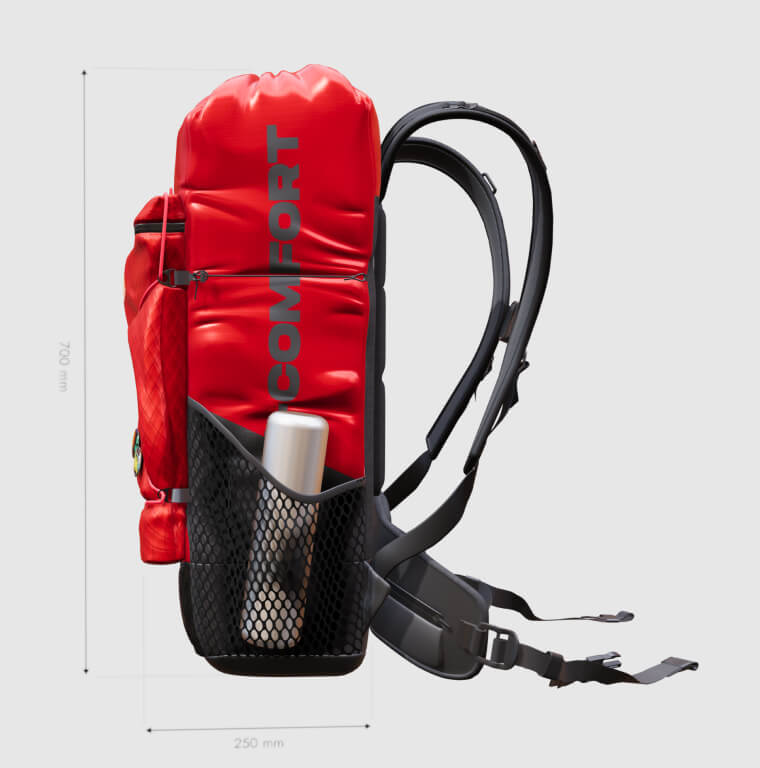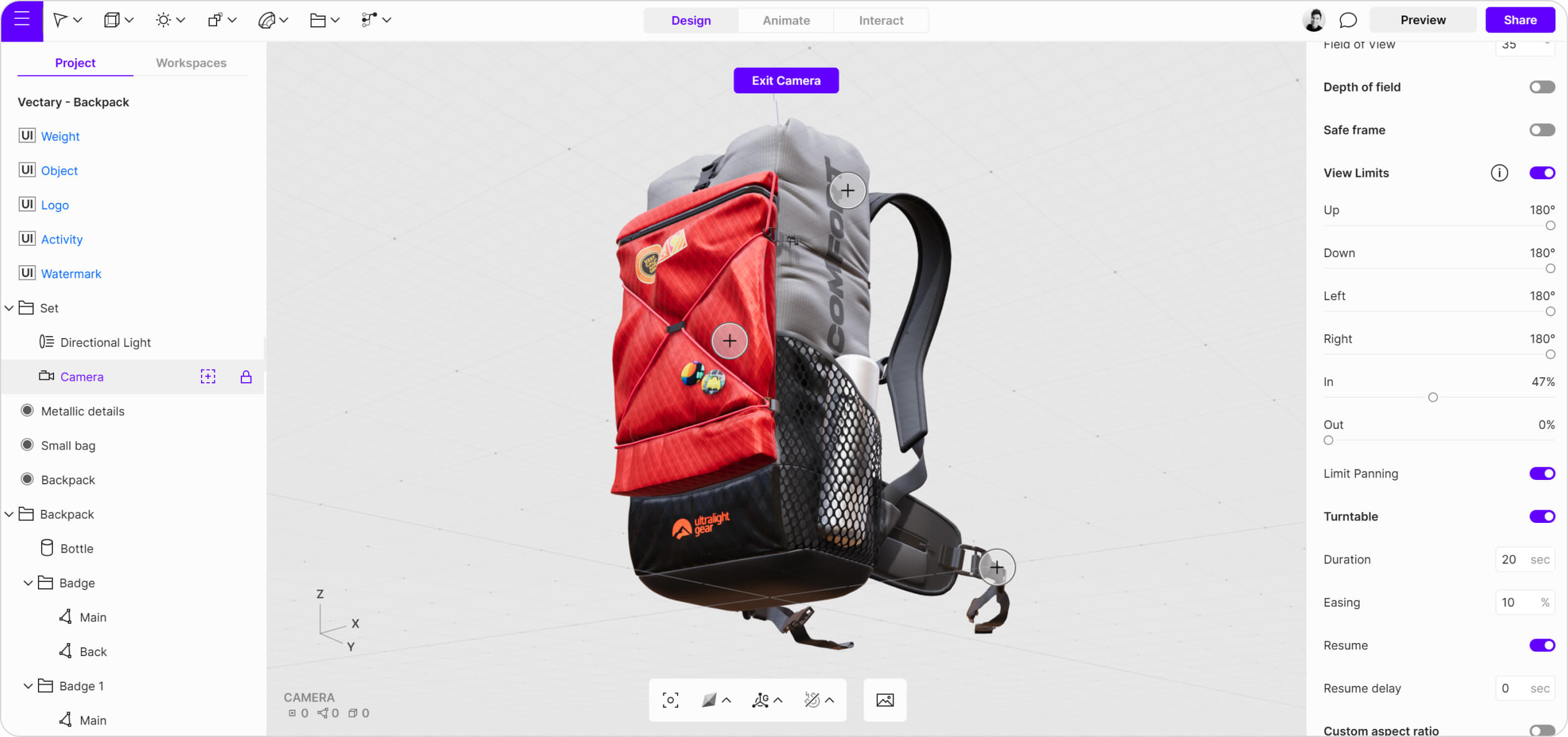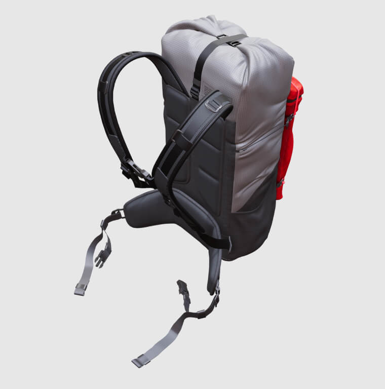 We designed the backpack model in 3D Studio Max and imported it as an .obj file. It was crucial to create highly detailed geometry to ensure the model looked as realistic as possible. After completing the model, we prepared a variety of textures in Substance Painter and optimized them in Vectary studio. Graphics, badges, and dimensions were designed in Figma and linked to Vectary using Figma Frames. We chose a neutral background to make the backpack and the floating UI stand out in the scene.