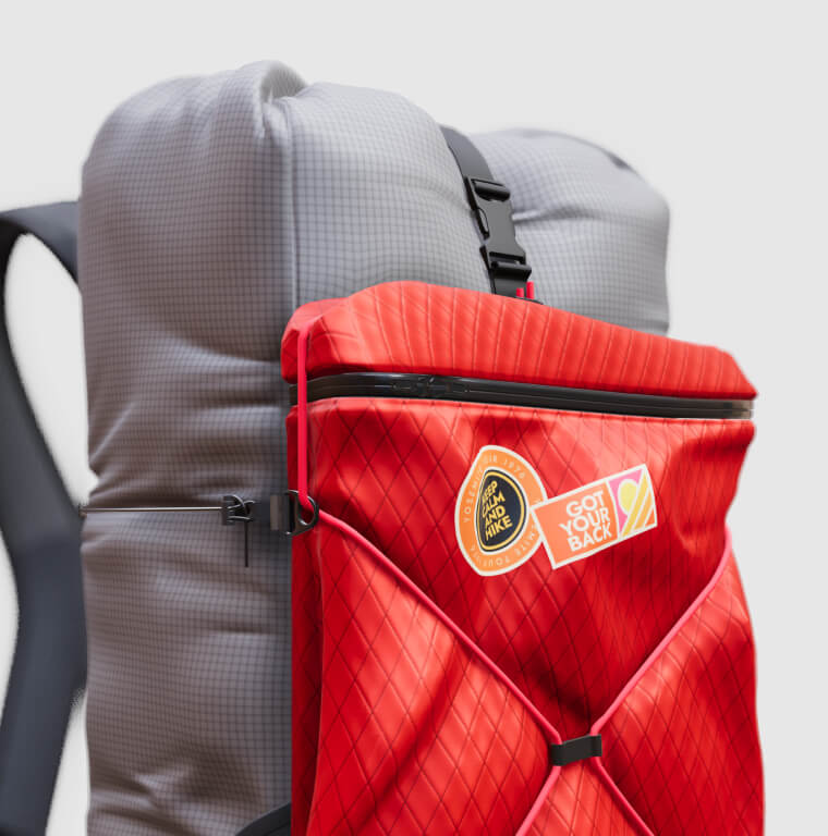 Ultralight backpack configurators let you change materials using multiple hotspots. You can choose from two main color combinations: grey/black or red/black. Each corner features FUI texts that provide additional information about the product.