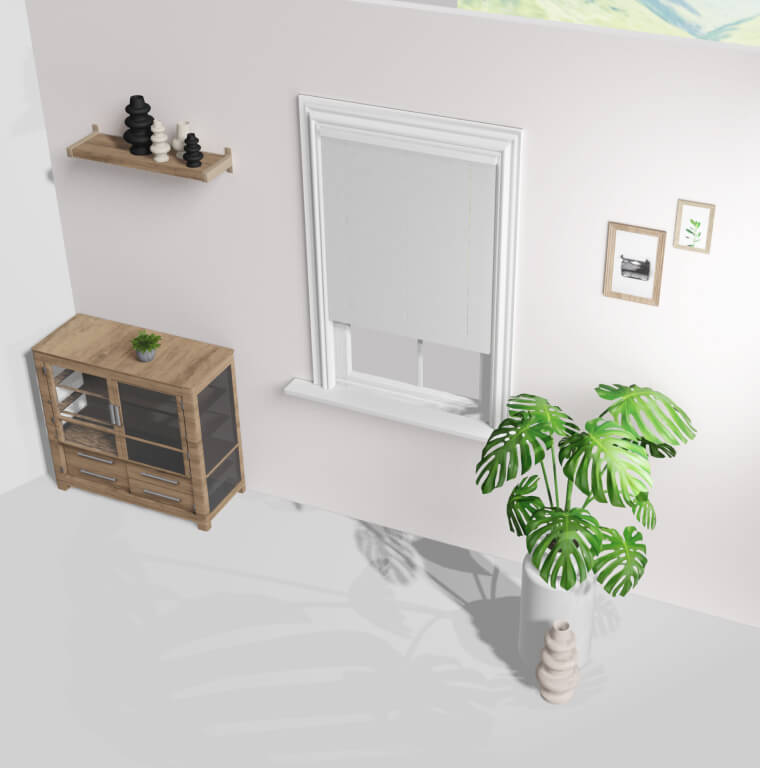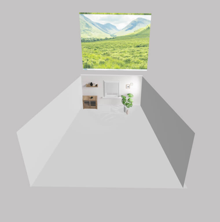 Tip: To reduce polygon count, only a backdrop wall is used, with camera limits set to prevent rotation. The environment behind the window is represented by a simple plane with an image texture.