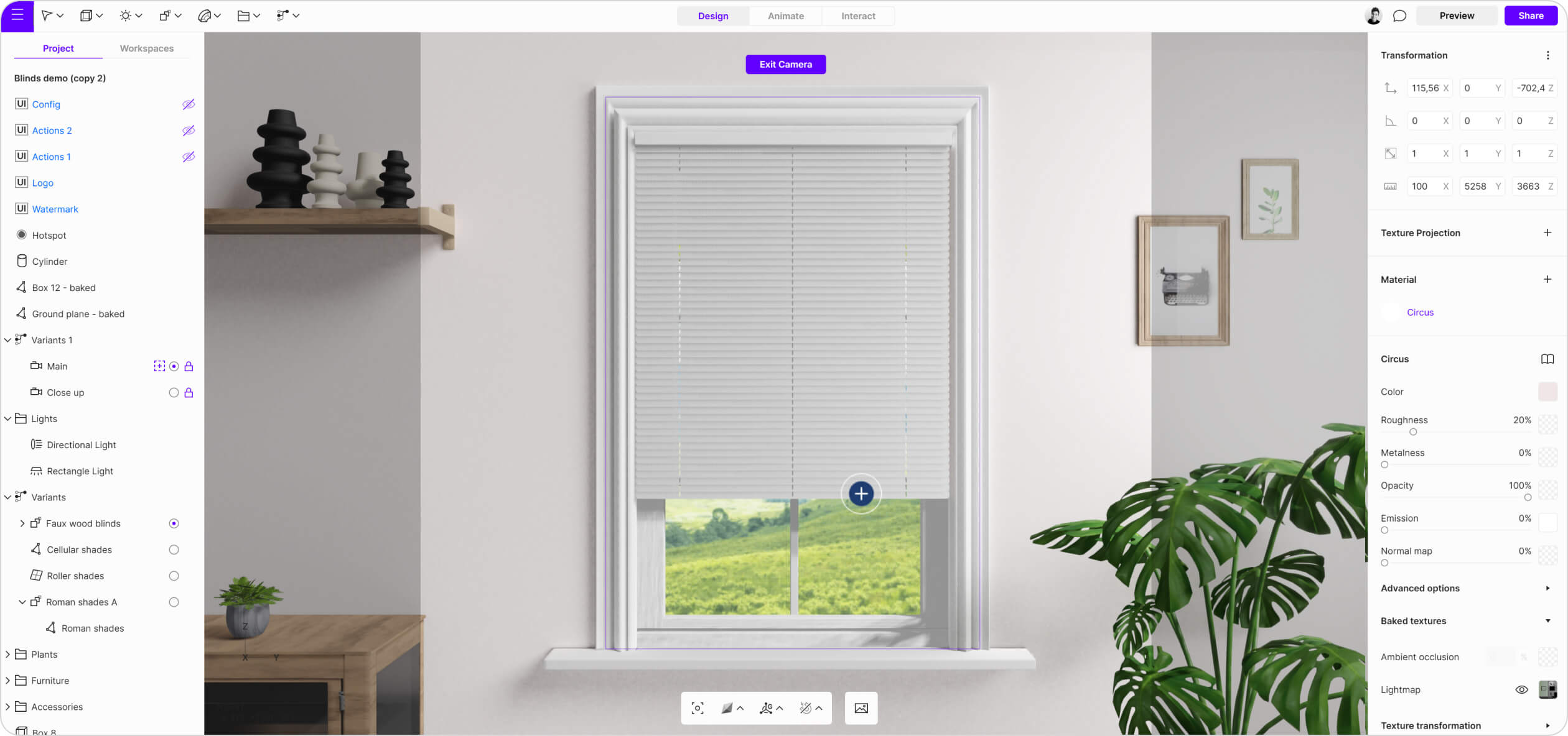 Designed with an embed on a website as the final destination, the 3D configurator lets users see their own personalized window blind in a realistic setting. The user can explore blind styles, materials, colors, sizes, and features. There is one additional benefit that comes at the end of the customization process, that lets the user download the image of their configuration. In a real-life use case, the picture can be downloaded and used as a digital reference or in a real store.