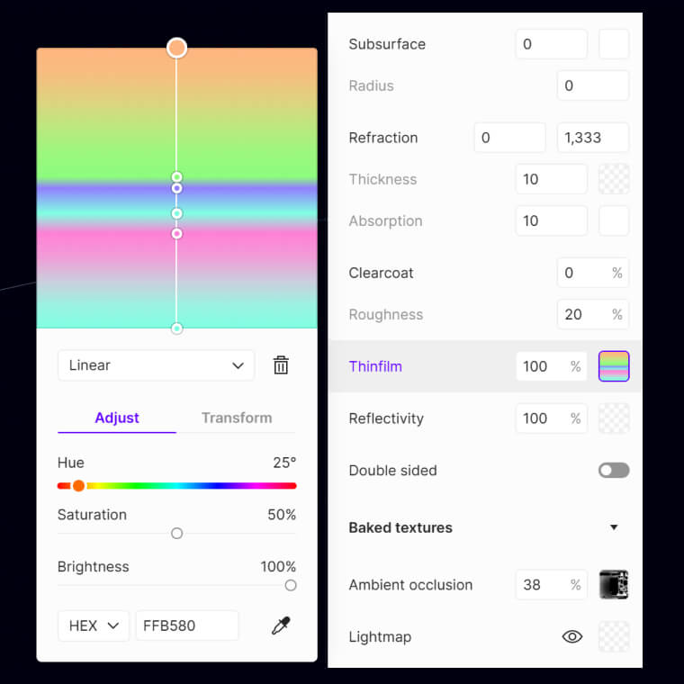 Tip: Clicking the icon with the color gradient swatch triggers a material change but also hides the gradient icon swatch and shows the black color swatch. Clicking the black color swatch hides itself and shows the color gradient swatch. This way, you can create a simple loop where you can always choose the next available option. The same principle applies to the emissive materials; you just hide and show more icons.