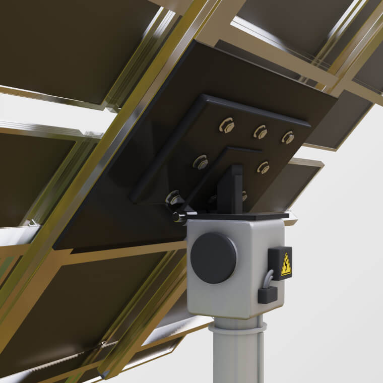 The project started with the precise modeling of the base stand for the solar panels, followed by the construction of a supportive frame and the modeling of an individual panel. By using the array modifier it was easy to add and arrange panels into groups of 5x2 and 3x2, which we could modify using Variants groups for flexible configuration changes.