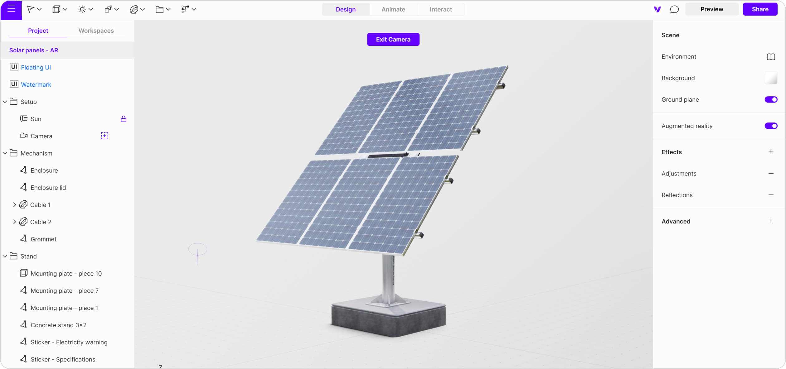 The solar panel configurator should have an interactive UI to switch between configurations of 3x2 and 5x2 panels. There is additional value in preparing the project for Augmented Reality. By setting up accurate object dimensions you can view the exact size of the panels and watch animations that demonstrate the optimal angles for following the sun.