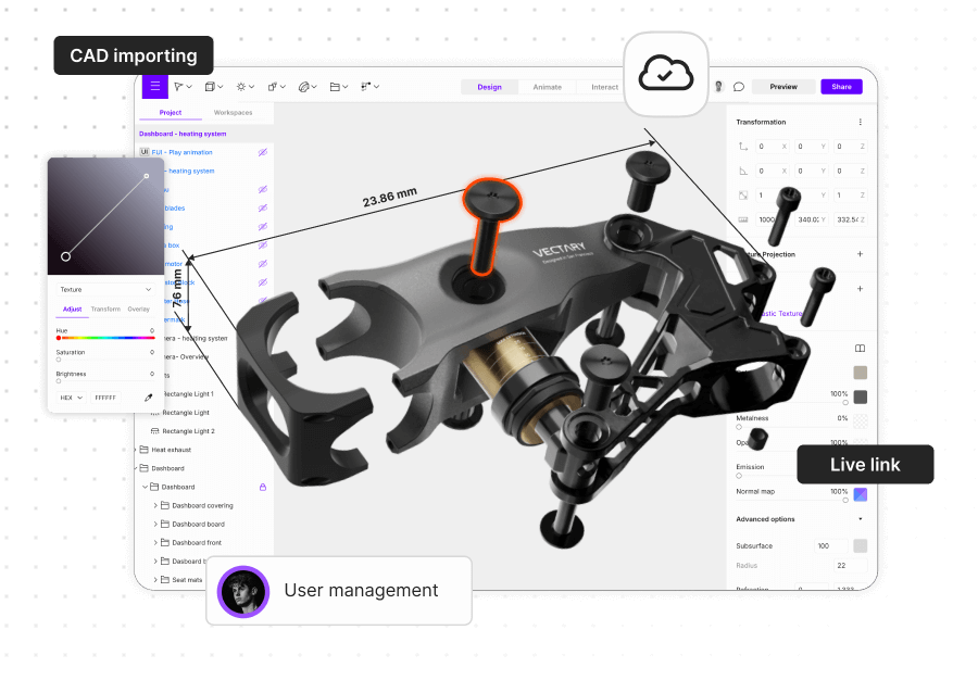 Import CAD files, then modify, explain and iterate on shapes, materials, and functions during early stages of product development.